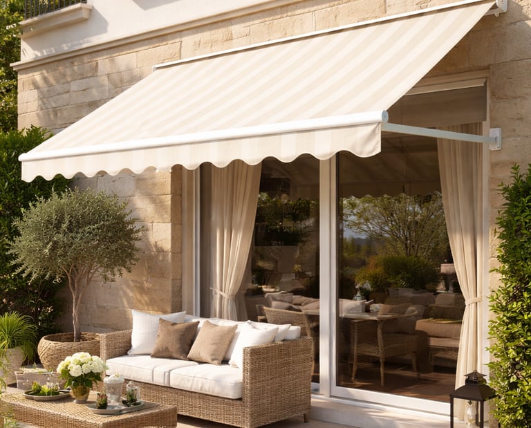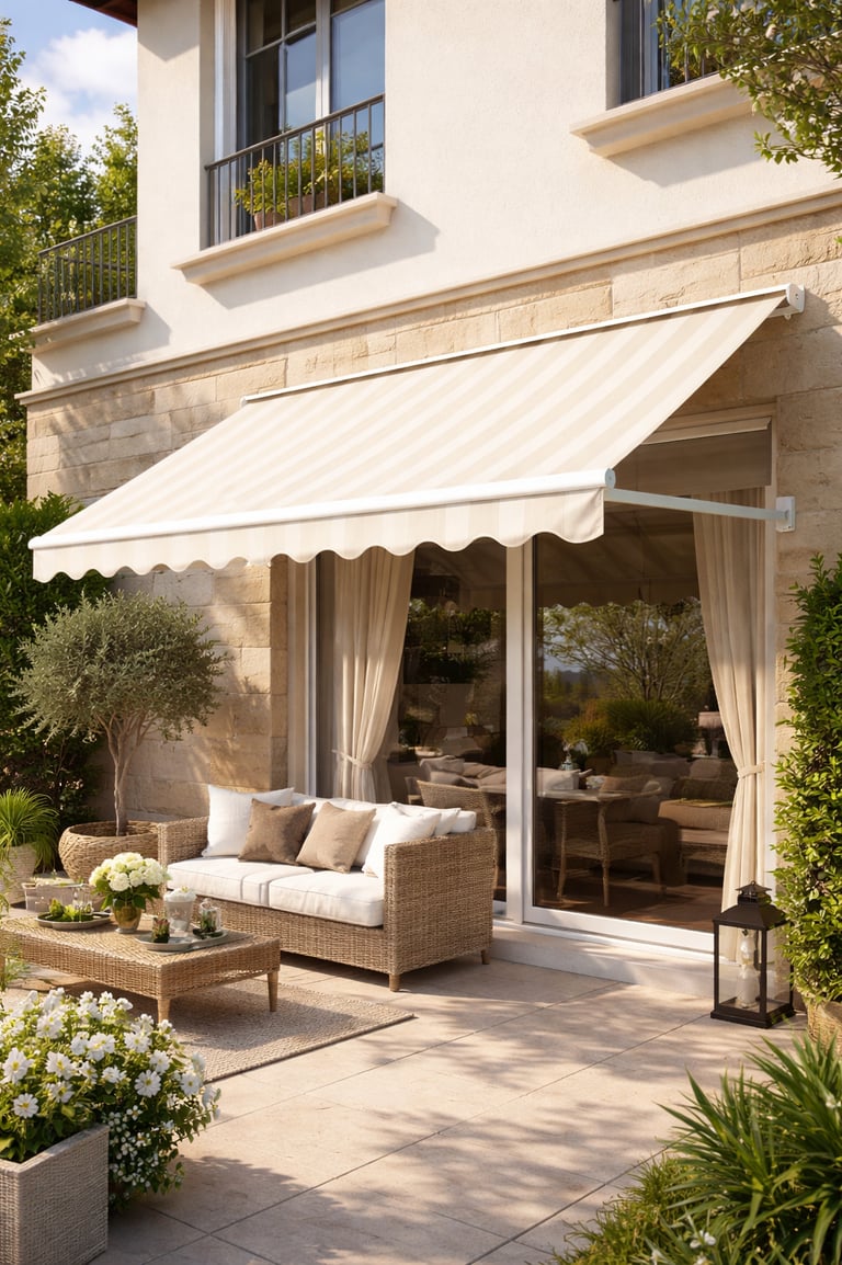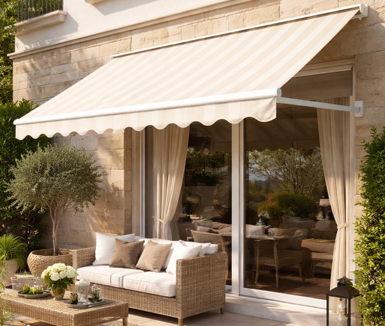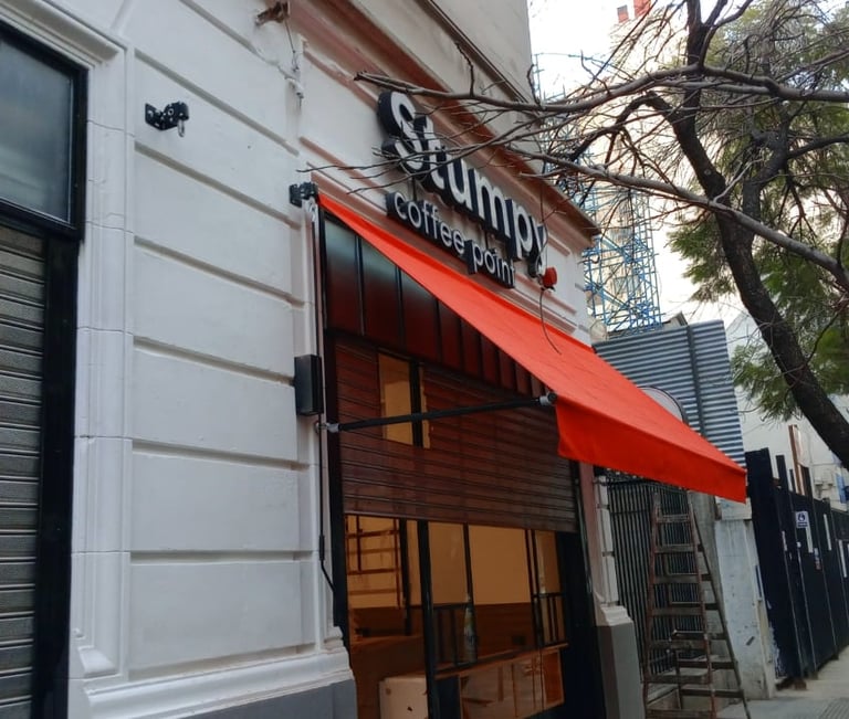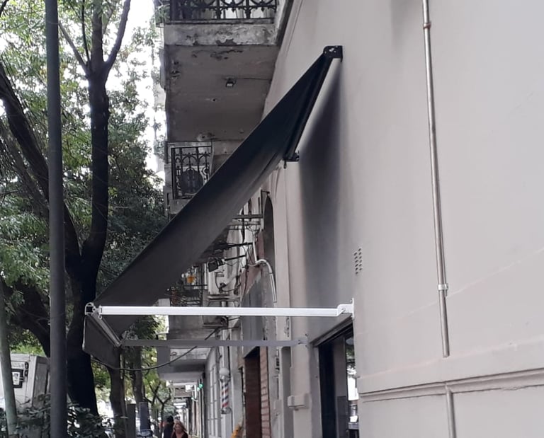El toldo punto recto es un sistema que se instala sobre ventanas o aberturas verticales. Sus brazos proyectantes permiten separar la lona del vidrio, generando sombra y ventilación.